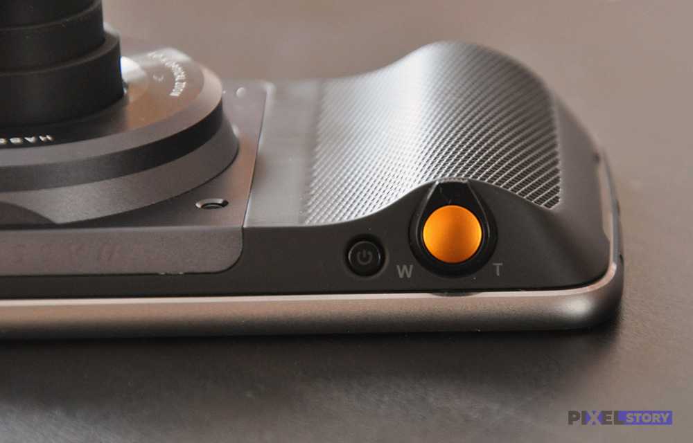 Удобно, что на корпусе есть выделенная клавиша съемки и включения, рычажок зуммирования (зум работает очень быстро), отдельные микрофоны, подсветка автофокуса. Но есть и вопросы. Камера чуть менее расторопная, по сравнению с родной — какое-то время требуется чтобы выдвинулся объектив, фокусировка-сохранение снимков быстрые, но медленнее чем у встроенной камеры.