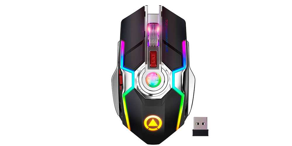 На восьмом месте рейтинга Mouse A5 составит достойную конкуренцию REDRAGON M910RGB в плане дизайна и цветовых эффектов: модель выглядит очень ярко и красиво. Для подключения к ПК достаточно вставить USB-приёмник, и мышку после её определения можно будет использовать. Чувствительность девайса изменяется специальной кнопкой в диапазоне от 800dpi до 1600dpi, как и в seenDa T28. Гаджет способен работать на собственном аккумуляторе, заряда которого хватит до 3 часов, а когда батарея сядет, нужно подсоединить через USB-шнур мышку к ПК и дождаться её полной зарядки.